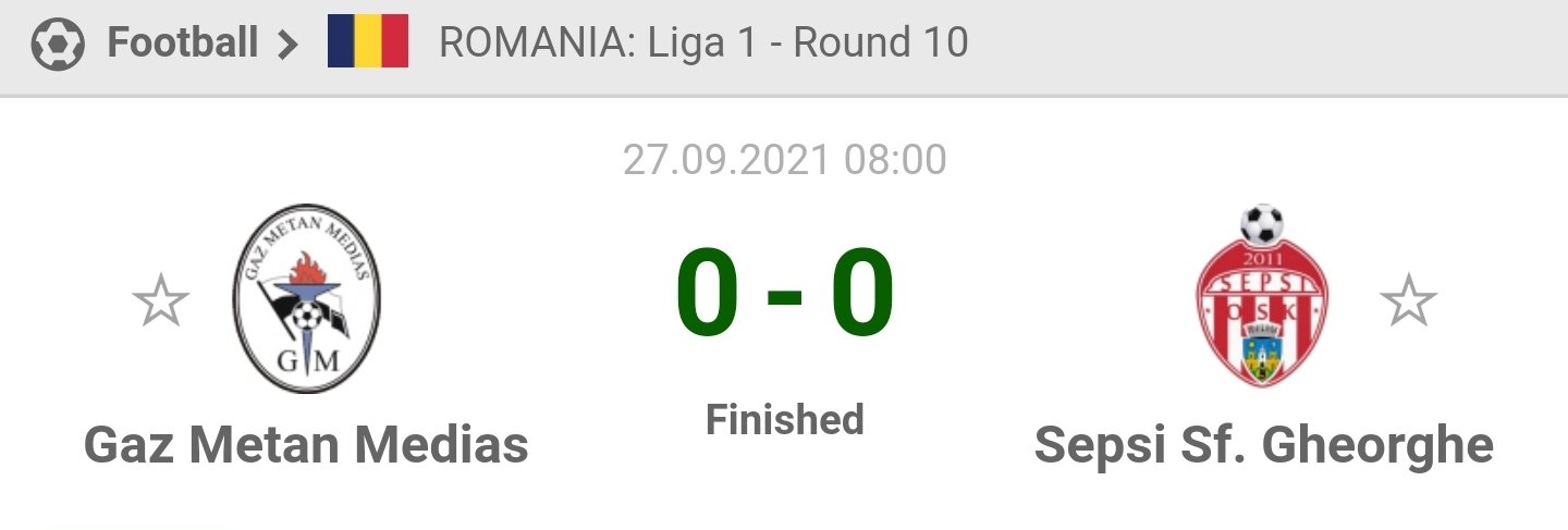 Looking at this match the best odds in the 90 minutes for the winner market are putting your money on Gaz Metan Medias is priced at 450 a bet on a draw result is 325 and betting on the winner to be ACS Sepsi is 185. Gaz Metan Mediaş vs Sepsi Livescore preview follow the match with the best information including stats incidents and best odds. When were creating football bet predictions for Gaz Metan Medias vs Sepsi OSK Sfantu Gheorghe we provide not only a written background for our soccer betting picks but also extensive info on each team and league Romanian Liga 1 also which includes their form head-to-head results and rosters for the game.